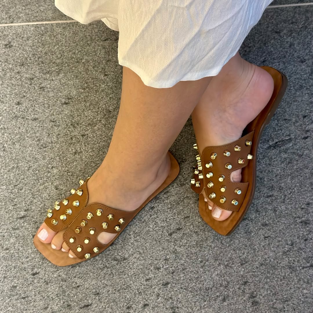 Rasteira feminina confeccionada em couro, unindo conforto, durabilidade e estilo. Possui design moderno na cor caramelo, com tiras adornadas por tachas metálicas que acrescentam um toque sofisticado e fashion ao visual. O modelo de calce fácil proporciona praticidade no dia a dia, enquanto a palmilha macia garante conforto ao caminhar. Ideal para compor looks casuais, urbanos e de verão com elegância.